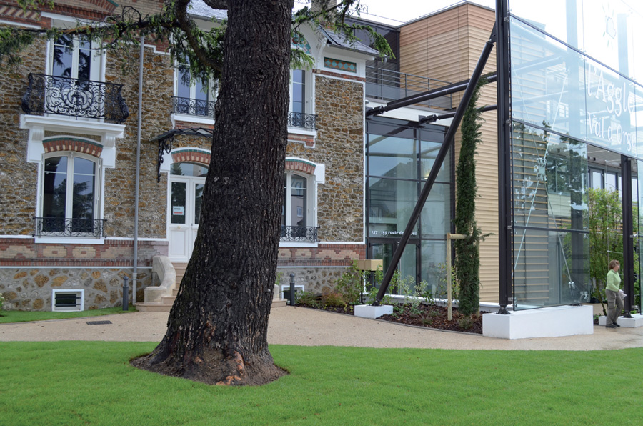 Le lien entre les deux bâtiments est assuré principalement par la vêture céramique de l’extension qui s'appuie sur une gamme de teintes claires ocres, rappelant les caractéristiques de la meulière et donnant une homogénéité à l'ensemble.
