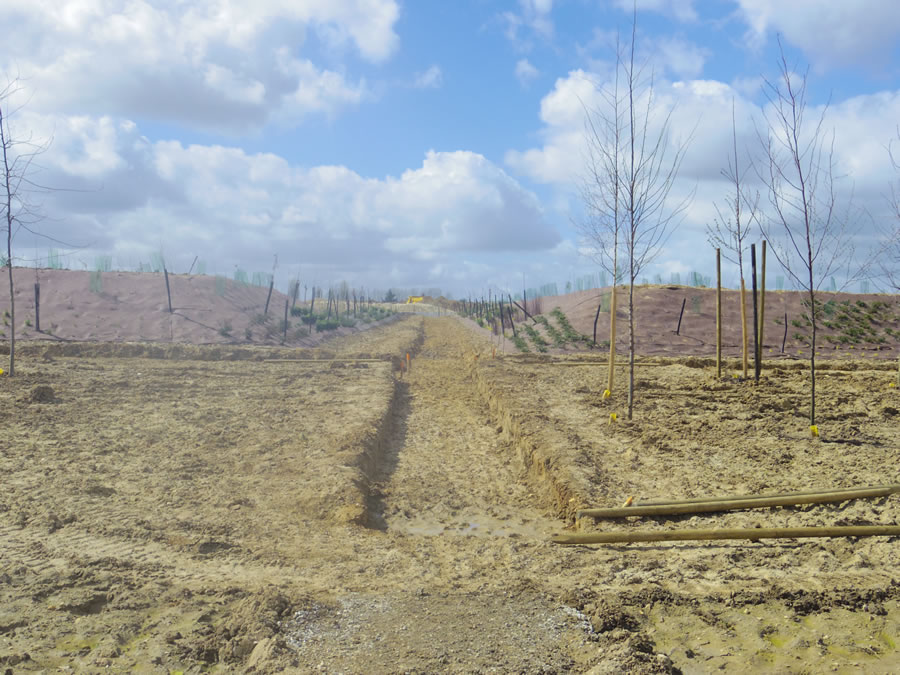 "Prolongeant la campagne, trois grands champs se glissent dans la ville et s'approprient les vastes horizons sur la vallée. Chemins et fossés parcourent ces étendues et tissent la trame du parc avec le parcellaire agricole. Réinterprétant, dans une orientation nord/sud, le transect de la vallée, les vergers s'installent sur un coteau tandis qu'un boisement touffu se déploie autour du fil sinueux d'une petite "rivière. Terrain d'expériences pour la dynamique végétale, ce dispositif en forme "archetype" installe le grand paysage du parc."